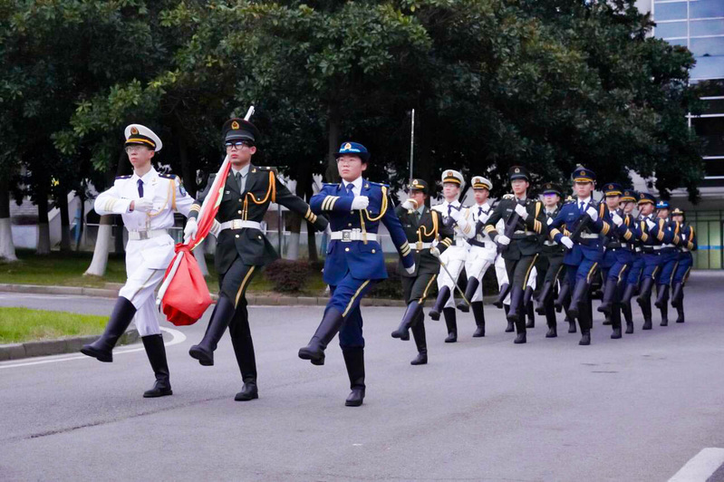 指挥员纪羽棋身姿挺拔如松,她清亮的口令划破清晨的宁静,擎旗手朱一波肩扛国旗,与护旗手郭轶厚、王宁欣并肩而行,步伐铿锵而统一,每一次落地都坚定有力。护旗方阵紧随其后,双手端正地握着95式步枪,脚步沉稳庄严,朝着旗台稳步前行。